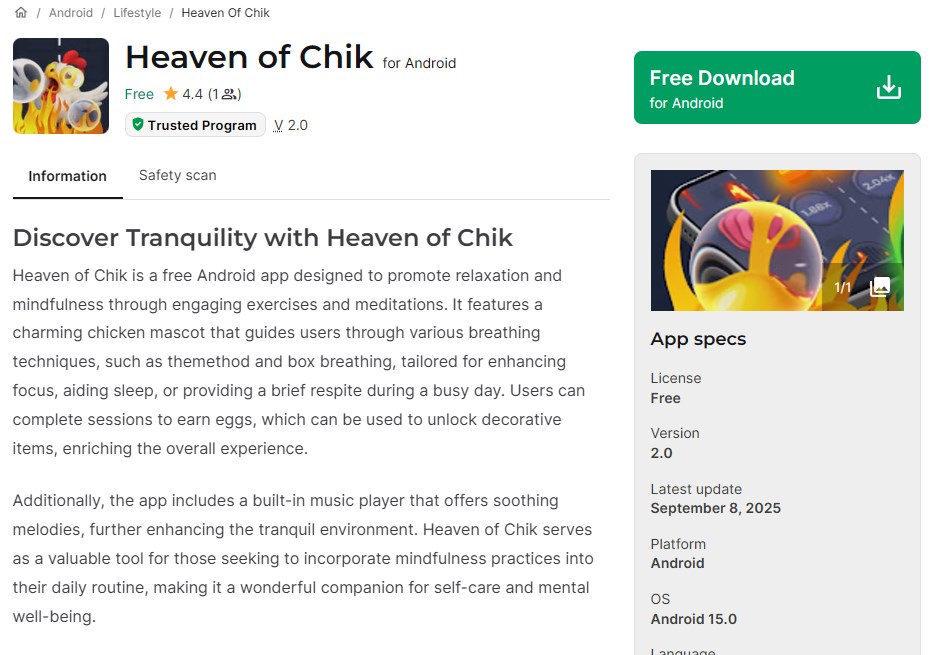 Difficile de passer à côté du ton décalé adopté par Heaven of Chik. L’univers visuel, porté par une mascotte de poule facétieuse, apporte immédiatement le sourire. Cette ambiance sympathique rend l’application accessible à tous, même aux moins expérimentés en matière de relaxation.